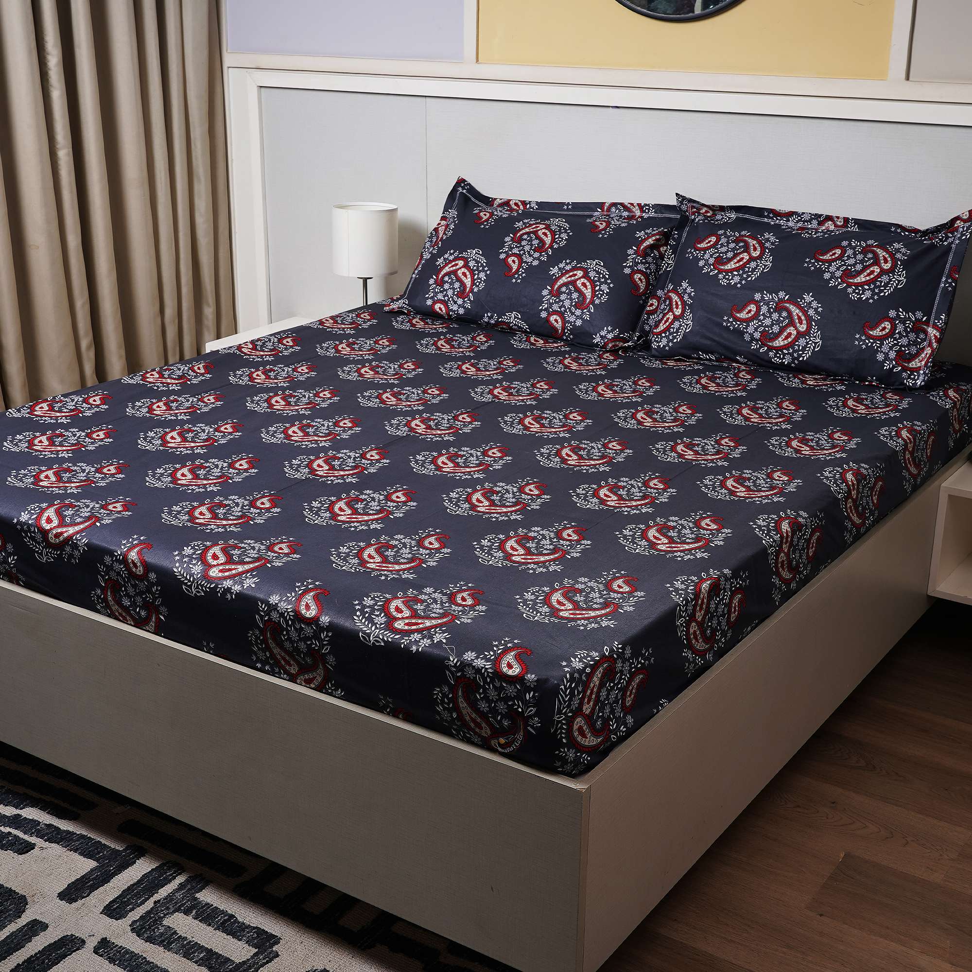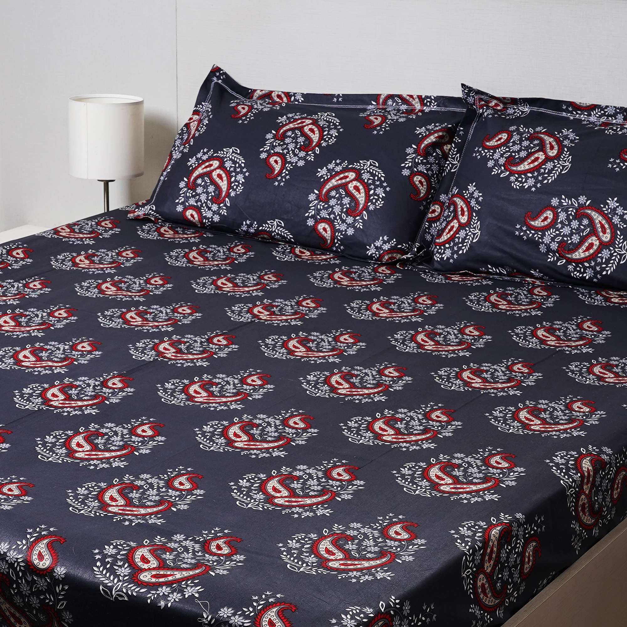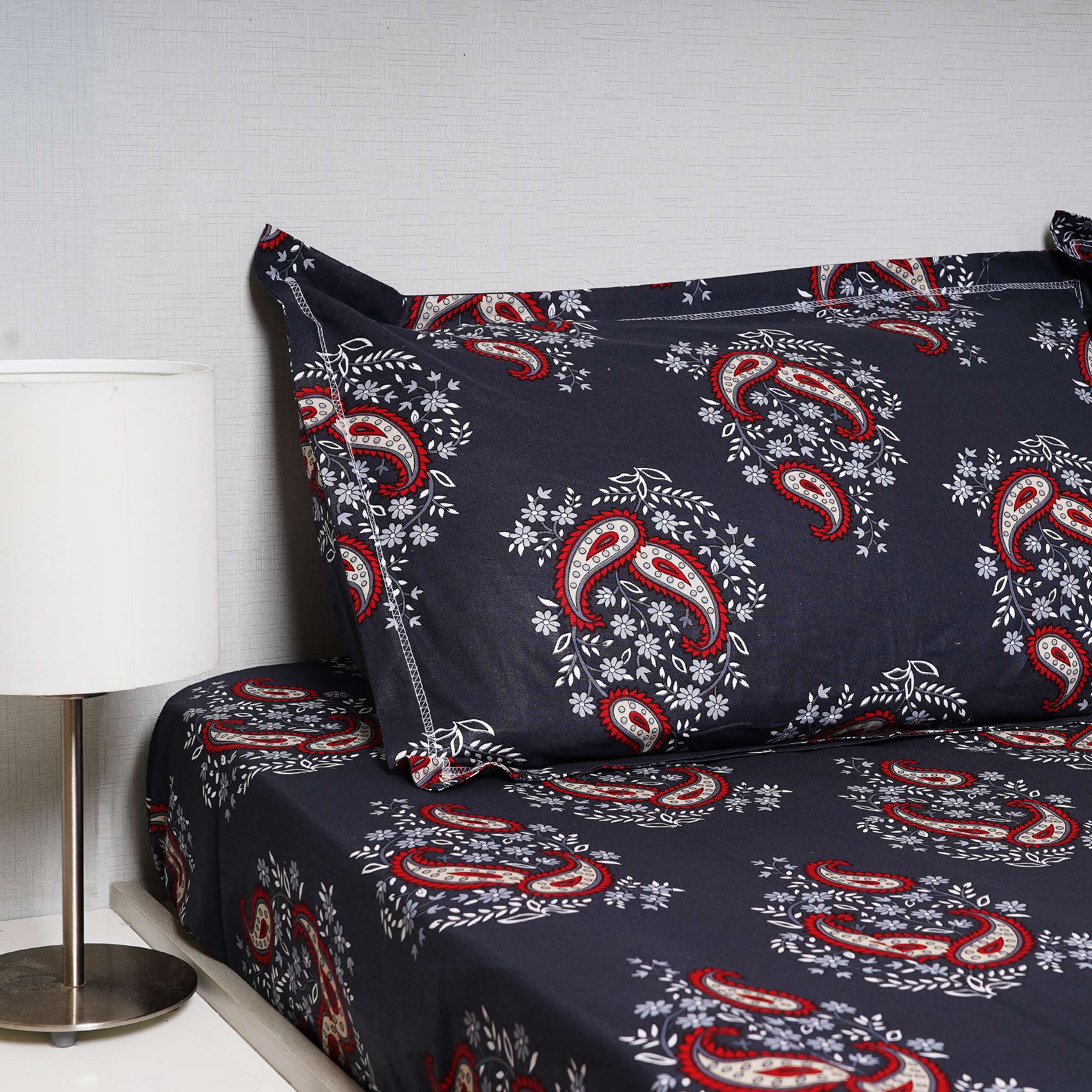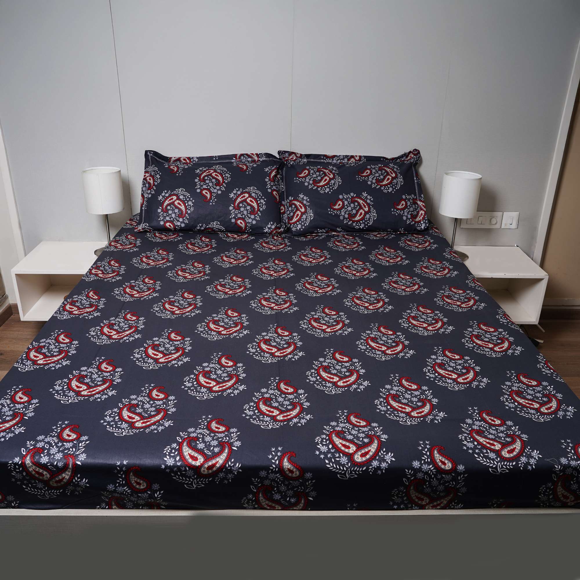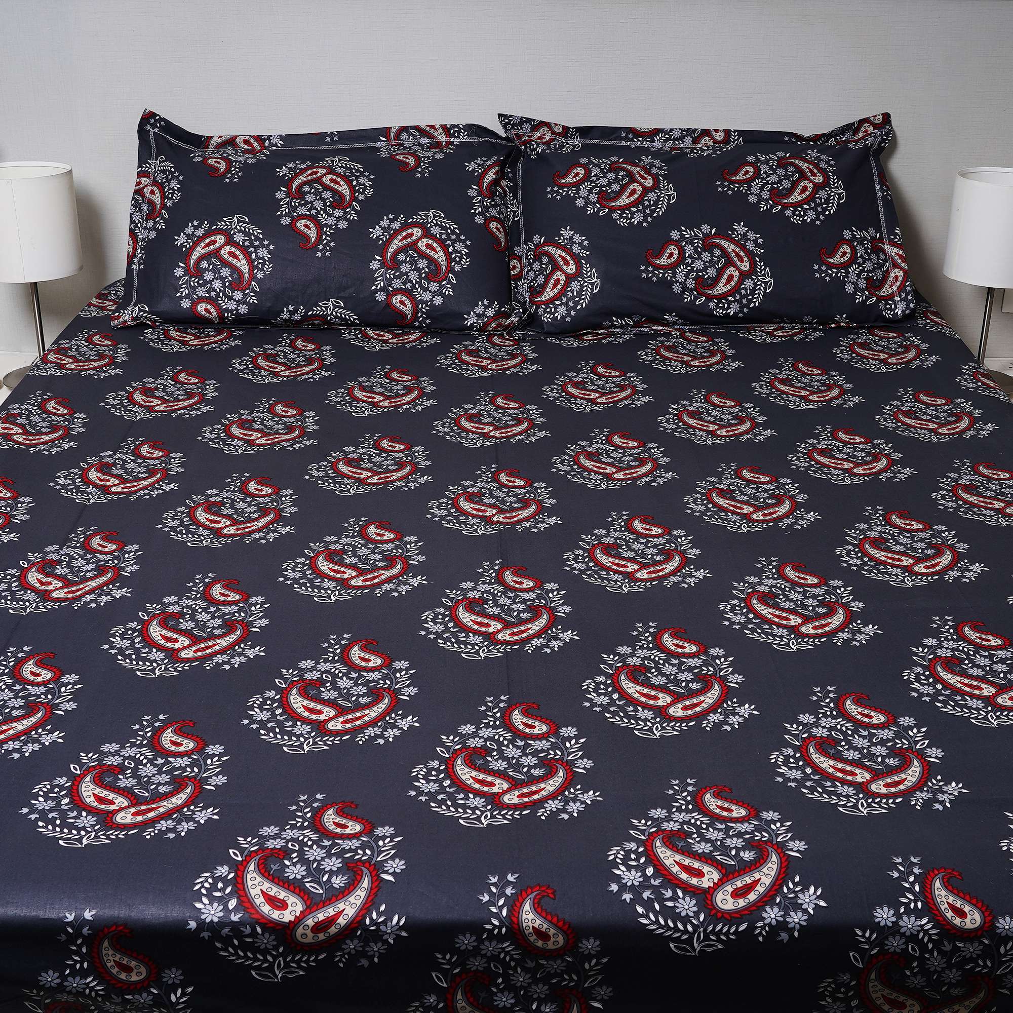Elegant red paisley motifs bloom against a deep midnight base, accented with delicate floral detailing. Midnight Paisley delivers a bold yet balanced charm, perfect for those who love classic patterns with a modern, moody touch.